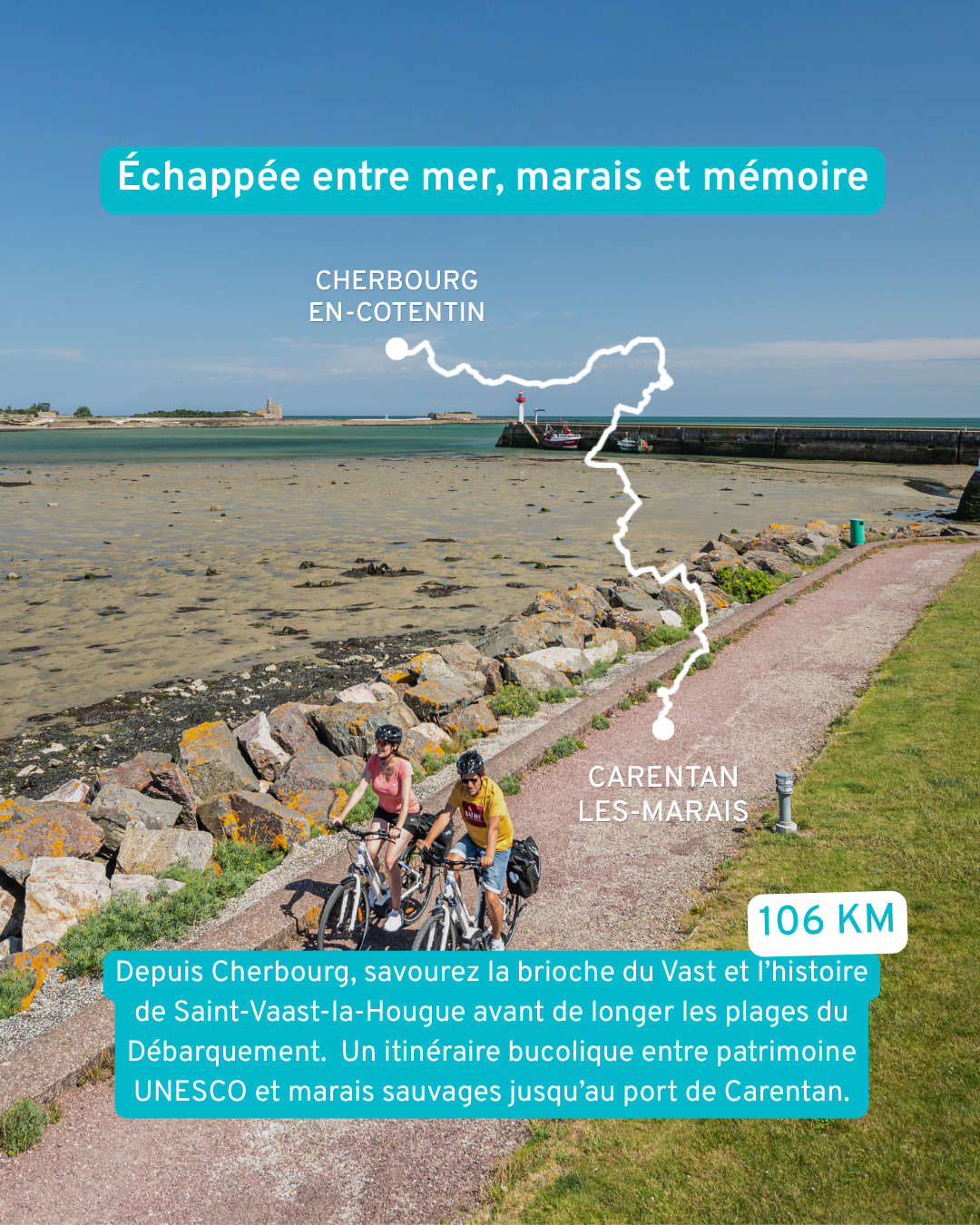Savourez la brioche du Vast avant de longer les plages du Débarquement. Un itinéraire bucolique entre patrimoine UNESCO et marais sauvages jusqu’au port de Carentan.