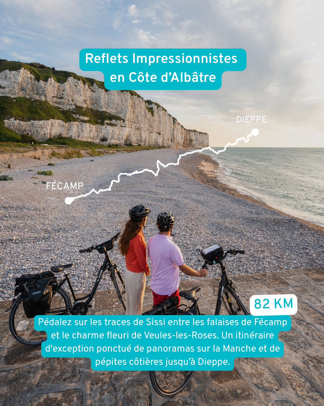Pédalez sur les traces de Sissi entre les falaises de Fécamp et le charme fleuri de Veules-les-Roses. Un itinéraire d'exception ponctué de pépites côtières jusqu'à Dieppe.