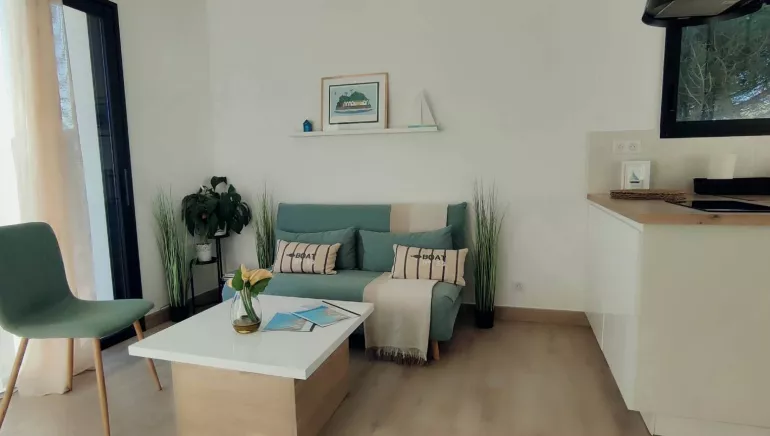 La maison, de conception inversée, propose deux chambres avec lits doubles et une salle d'eau avec douche à l'italienne au rez-de-chaussée, tandis que le salon et la cuisine entièrement équipée se trouvent à l’étage supérieur. Cette disposition permet de profiter pleinement de la vue sur la mer depuis la terrasse commune.