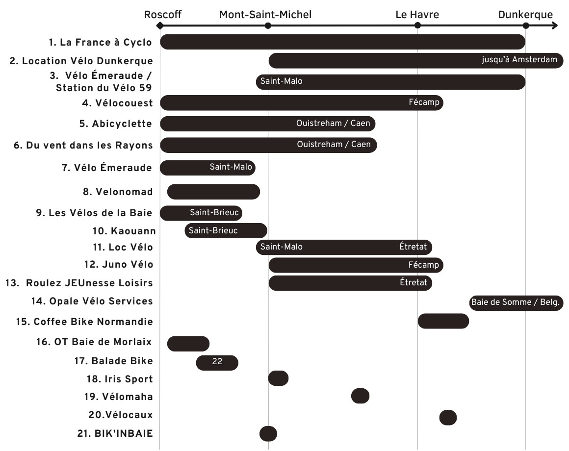 💡 Voici les zones d'intervention des loueurs de vélo one way sur La Vélomaritime (voir les conditions de chacun plus bas) :